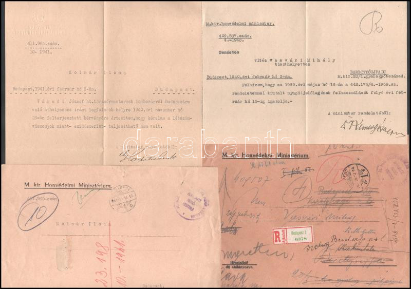 Leírás: 1939-1943 A M. Kir. Honvédelmi Minisztérium levelezése hivatali ügyekben, 5 db aláírással ellátott, gépelt levél, borítékkal