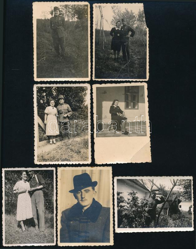 Leírás: 1941 Katona feleségével, egyik képen a feleség felveszi férje egyenruháját, 7 db fotó, közte sérültek, 8,5×6 cm