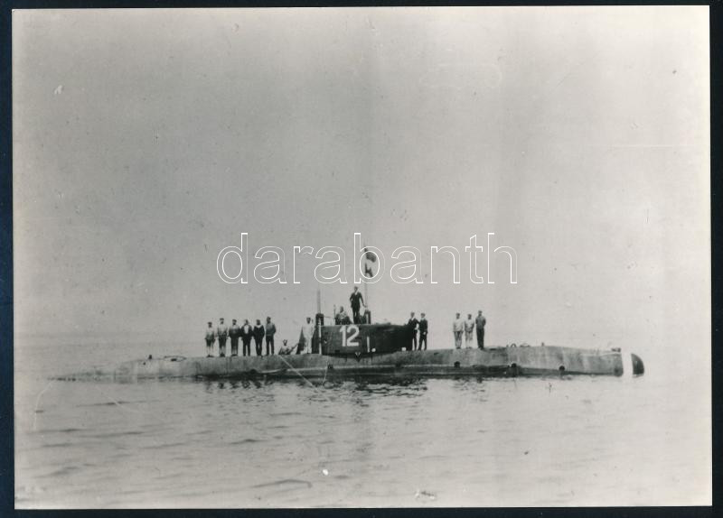 Az Osztrák-Magyar Cs. és Kir. Haditengerészet SM U-12 (U-XII) tengeralattjárója, a legénység tagjai közt a parancsnoki torony tetején álló Egon Lerch sorhajóhadnaggyal. Fotó, későbbi nagyítás, 13x18 cm (Az 1914 augusztusától Egon Lerch sorhajóhadnagy parancsnoksága alatt hajózó tengeralattjáró 1915 augusztusában Velence közelében aknának ütközött, és teljes legénységével odaveszett; ezzel az U-12 lett az első elsüllyesztett osztrák-magyar tengeralattjáró az I. világháborúban.)