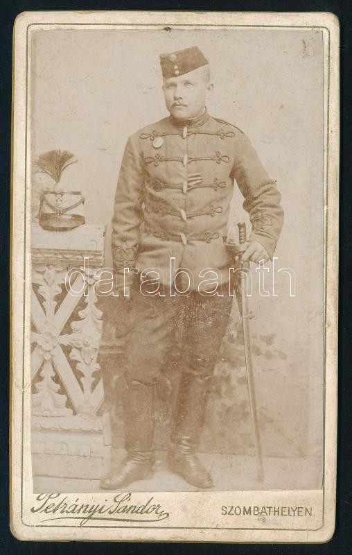 cca 1890-1900 A szombathelyi 11. huszárezred fiatal huszárjának egészalakos portréja, vizitkártya Petrányi Sándor szombathelyi műterméből, a hátoldalon feliratozva, 10,5x6,5 cm. Ritka! (A korábbi 11. Székely Határőr Huszárezred a kiegyezést követően a közös hadsereg része lett; 1889-ben, az újonnan elkészült Ferenc József Lovassági Laktanya átadásának évében helyezték át az ezredet Szombathelyre, ahol 1912-ig állomásozott.)