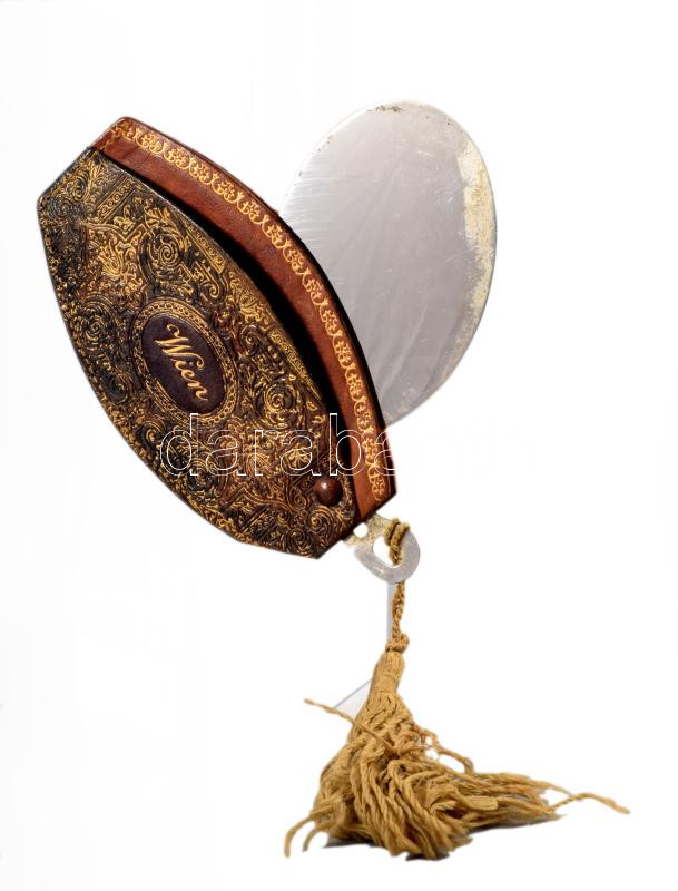 Leírás: 19. sz. vége, Bécsi fém tükör, díszes tokban, tokból kihajtható, 10x7 cm
