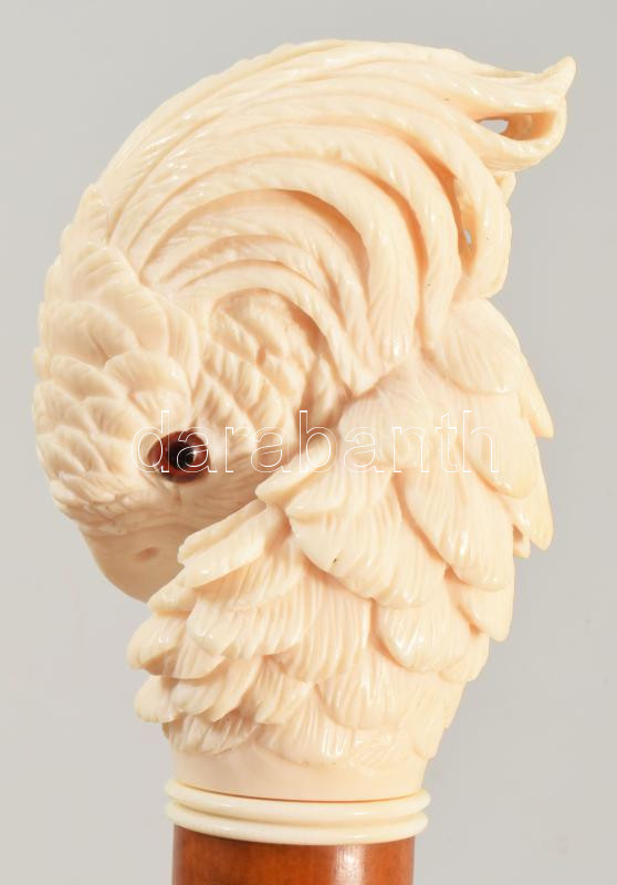 Leírás: Sétapálca fej. Sólyom fej formájú, faragott elefántcsont, mahagóni. XIX. sz. kis sérüléssel 22 cm