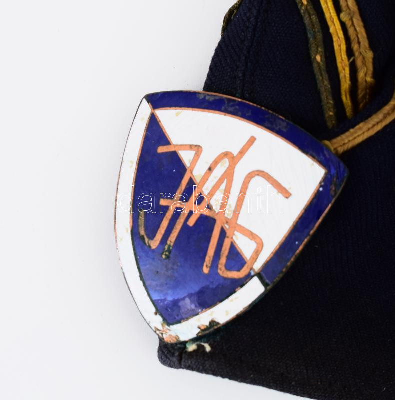 cca 1945-1949 Iskolai sapka, diáksapka, "JÁG" (Jedlik Ányos Gimnázium) zománcozott sapkajelvénnyel, belül varrott monogrammal, megkímélt állapotban, a jelvényen kis zománchibákkal