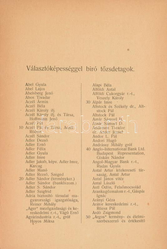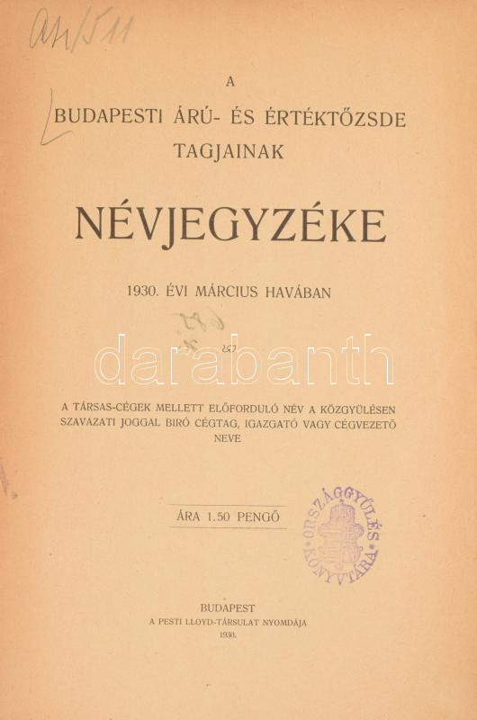 1930 Budapesti Árú- és értéktőzsde tagjainak névjegyzéke. Bp., 1930. P... https://www.darabanth.com/hu/510-Gyorsarveres/510.0/Mutargy-papirregiseg-egyeb/Nyomtatvanyok~821/1930-Budapesti-Aru-es-ertektozsde-tagjainak-nevjegyzeke-Bp-1930-Pesti-Lloyd-39p-KiadC3~II3455665