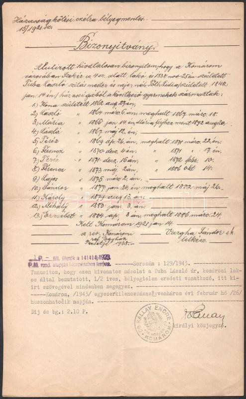 Leírás: 1943 Komárom, anyakönyvi bizonyítvány szitás mester részére