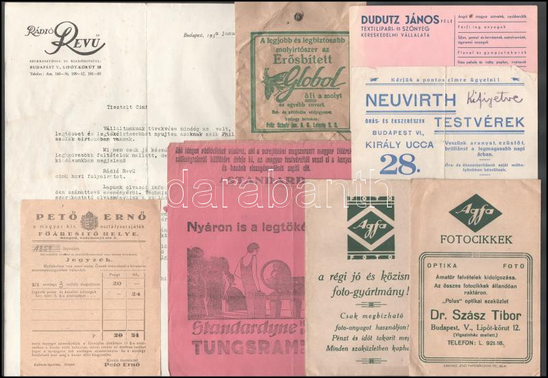 Leírás: 26 db vegyes reklámnyomtatvány (Minerva zseblámpa, Global molyirtó, Agfa, stb.)