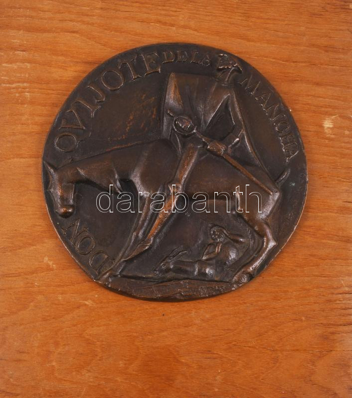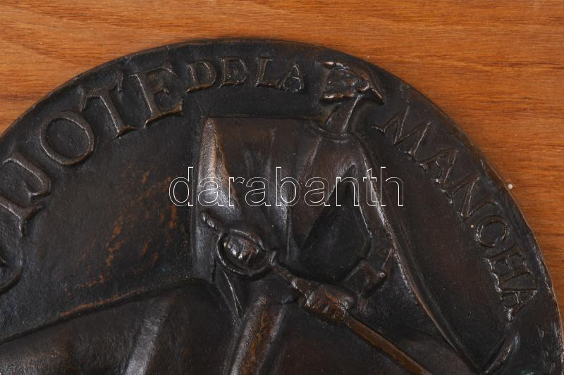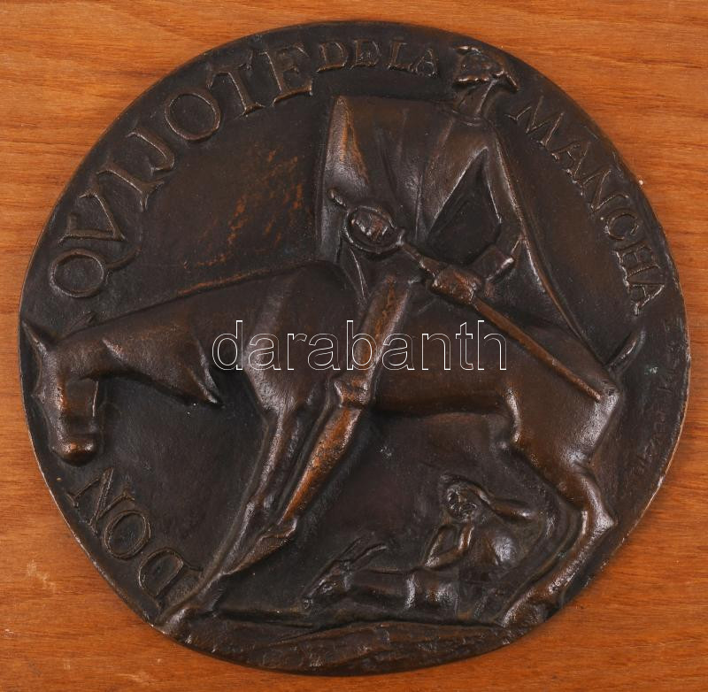 Leírás: Olcsai Kiss Zoltán (1895-1981): Don Quijote. Bronz plakett falemezre rögzítve, d:15,5 cm, 26×21 cm