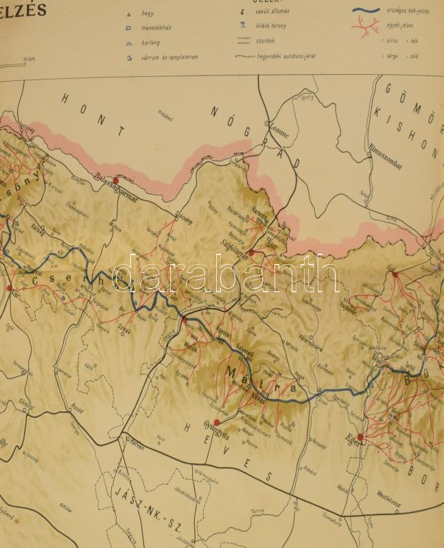 Leírás: 1938 Az országos kék túrajelzés térképe. Tervezte a M. T. Sz. útjelző bizottsága, (Strömpl G. és Babós I.) Magyar Turista Szövetség 90x31 cm. Hatjva