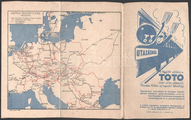 Leírás: 1951 Magyarország autóbuszhálózatának térképe, hátoldalán a külföldi összeköttetések hálózata, illetve Totó reklám, 19x30,5 cm