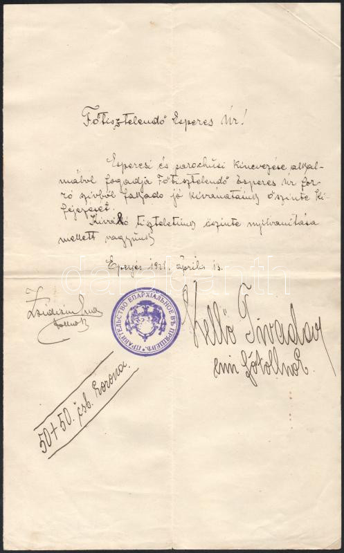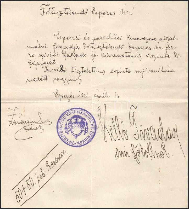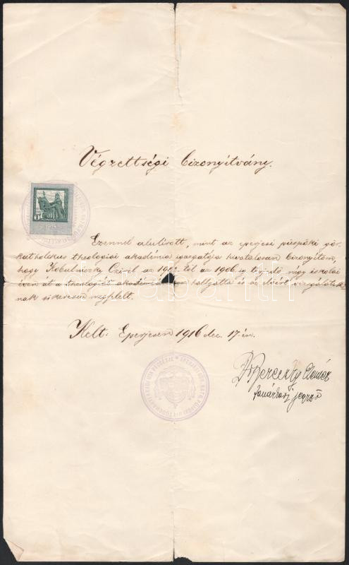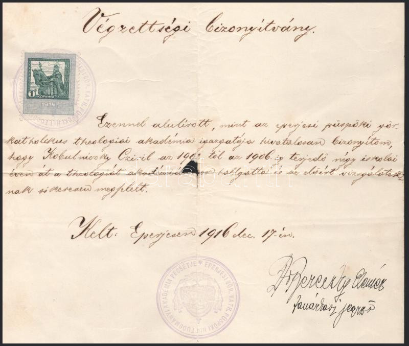 1916-1921 Eperjes, Kobulniczky (Cirill) Cyrill (1882-1949) görögkatolikus kanonok 2 db irata: Az eperjesi gör. kath. püspöki hittudományi akadémia által kiállított végzettségi bizonyítványa (1916), 1K okmánybélyeggel, kisebb sérülésekkel + Esperesi és parochusi kinevezése alkalmából kapott gratuláló levél (1921)
