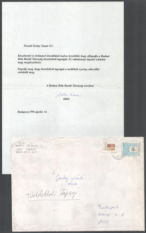 Leírás: 1998 Grétsy László (1932-2024) nyelvész részére a Radnai Béla Baráti Társaság által adományozott tiszteletbeli tagsági oklevél, borítékkal.