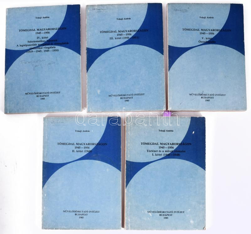 Leírás: Tokaji András: Tömegdal Magyarországon 1945-1956 - Történet és a művek elemzése (I.-V.) Teljes sorozat. Bp., 1985 Művelődéskötató intézet. Dedikált!