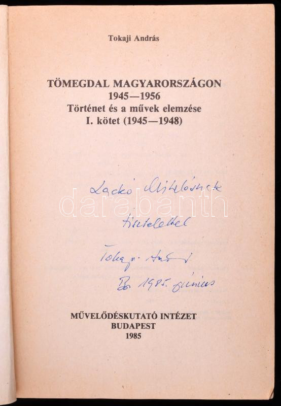 Tokaji András: Tömegdal Magyarországon 1945-1956 - Történet és a művek... https://www.darabanth.com/hu/510-Gyorsarveres/510.0/Mutargy-papirregiseg-egyeb/Zenetortenet-Kottak-Hangszerek~819/Tokaji-Andras-Tomegdal-Magyarorszagon-1945-1956-Tortenet-es-a-muvek-elemzese-I-V-Telj~II3444253