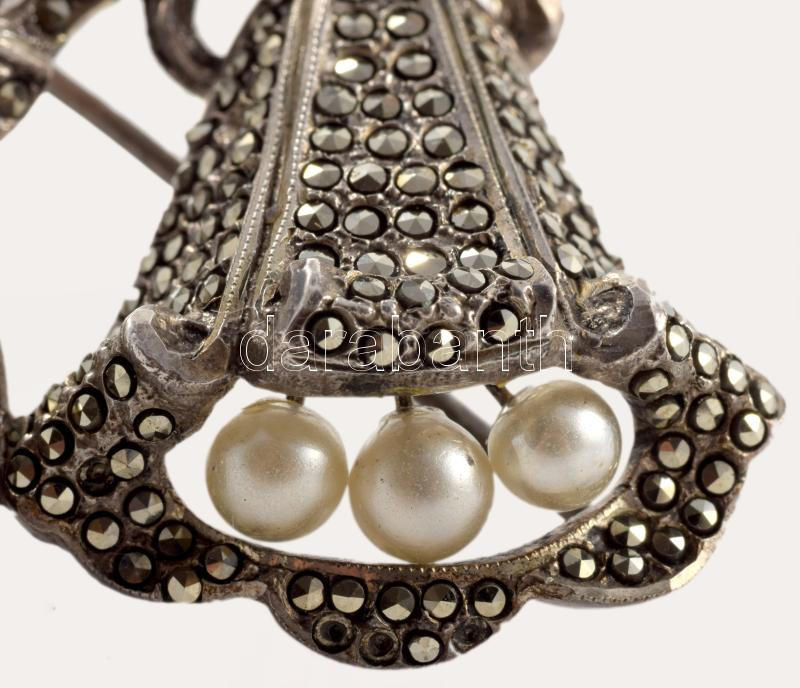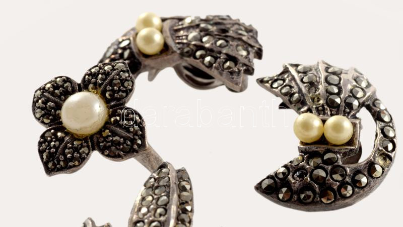 Antik ezüst (Ag) ékszer szett gazdag markazit berakással, illetve gyöngy ékítéssel, gyűrű m: 52, klipsz pár és virágalakú bross, 1-1 kőhiánnyal, jelzett, bruttó 30g