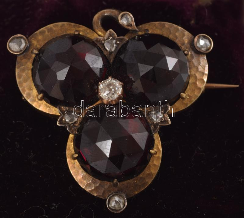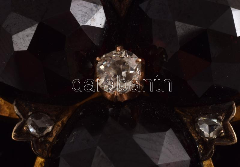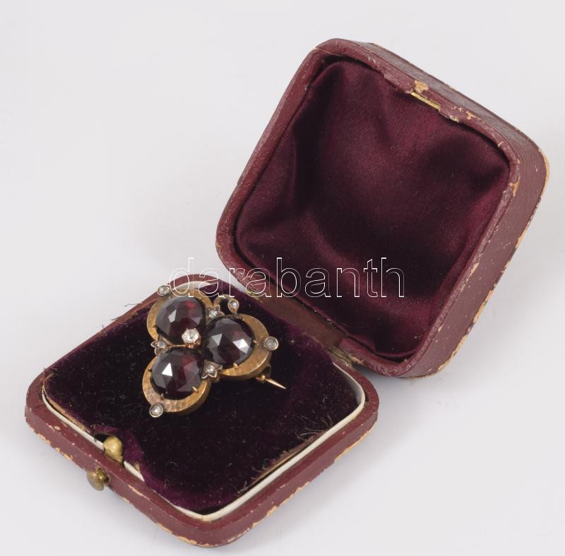 Arany (Au) bross, 3 darab nagy gránát, illetve 8 darab 0,07ct alatti g... https://www.darabanth.com/hu/510-Gyorsarveres/510.0/Nemesfem-disztargyak-ekszerek-dragakovek/Nemesfem-disztargyak-ekszerek-dragakovek~1110/Arany-Au-bross-3-darab-nagy-granat-illetve-8-darab-0-07ct-alatti-gyemant-berakassal-jelzet~II3455876