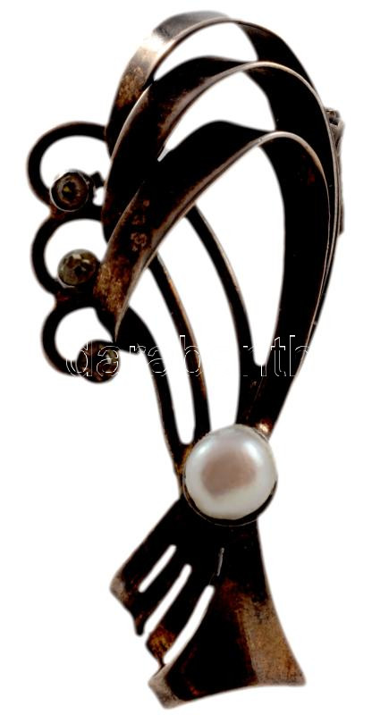 Leírás: Ezüst (Ag) bross, gyönggyel, jelzett, h: 4,5 cm, bruttó 5,8g