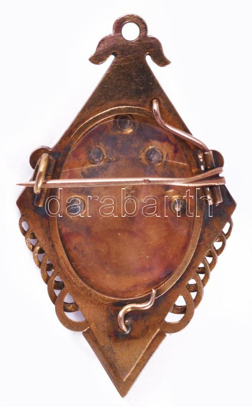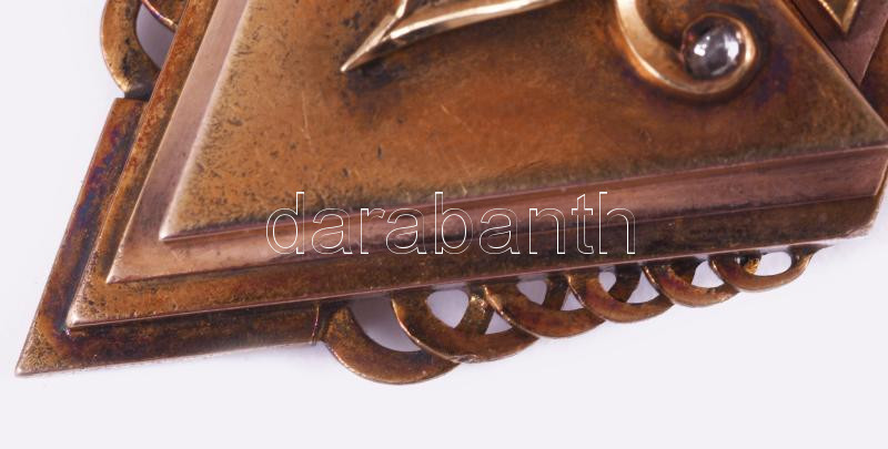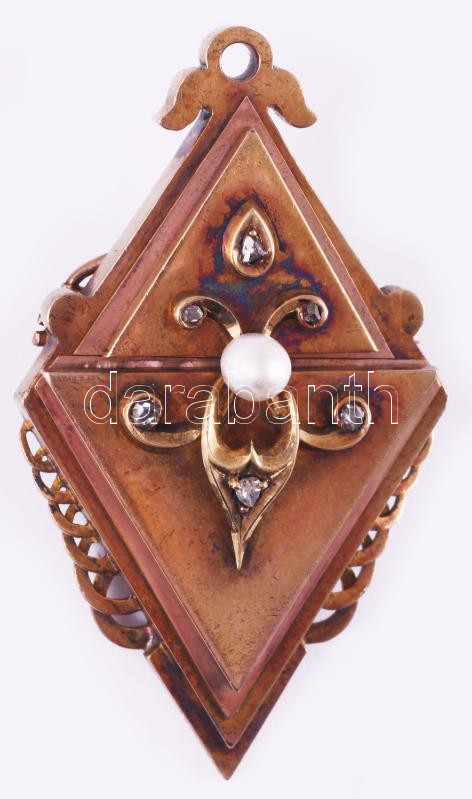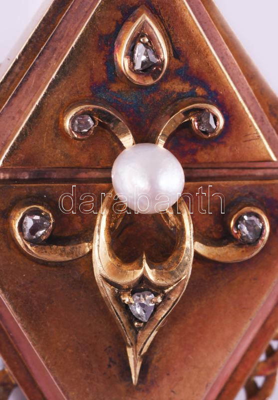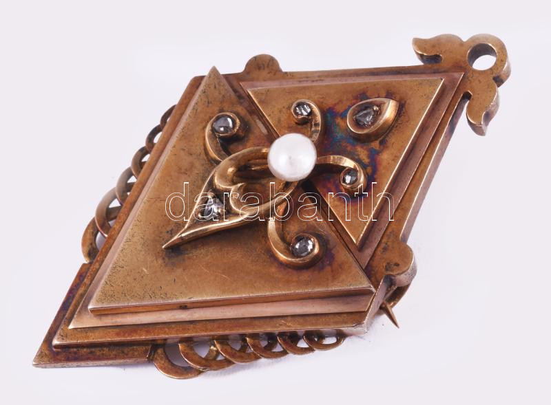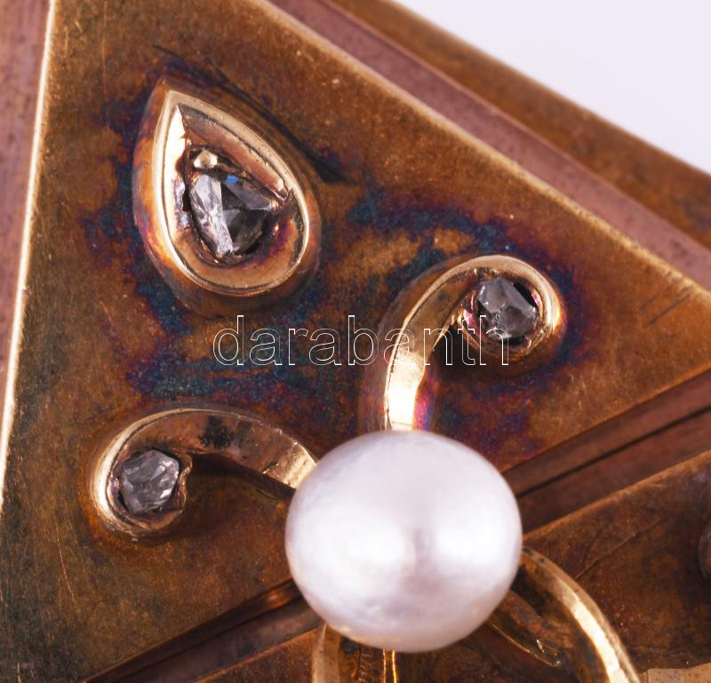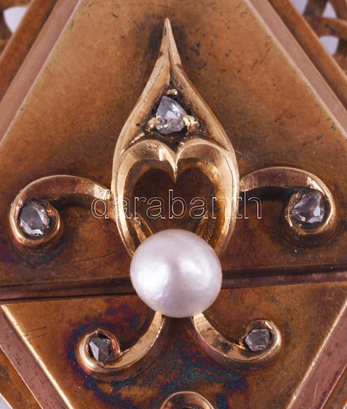 Szecessziós stílusú arany (Au) bross, 14k, 6 darab kisméretű gyémánt berakással, illetve feltehetően igazgyöngy rárakással, jelzett, 5,5x3,5 cm, bruttó 17,7g /// Art Nouveau?style gold (Au) brooch, 14k, set with 6 small diamonds and presumably adorned with a natural pearl, marked, 5.5×3.5 cm, gross weight 17.7 g.