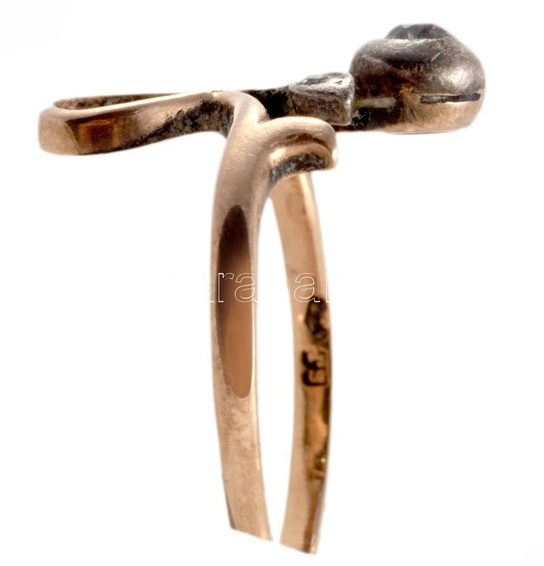 Leírás: cca 1900-1920 Arany (Au) gyűrű, 14k, ezüst (Ag) foglalatban cca 0,15ct gyémánt berakással, m:53, jelzett, bruttó 2,4g