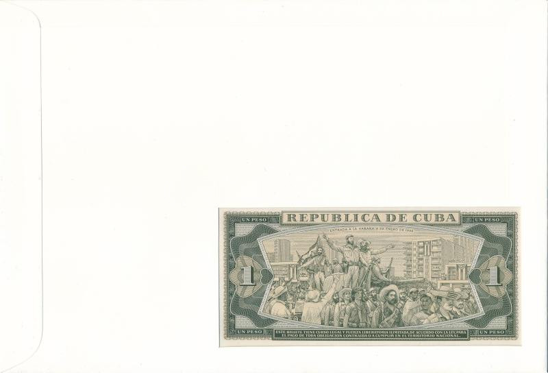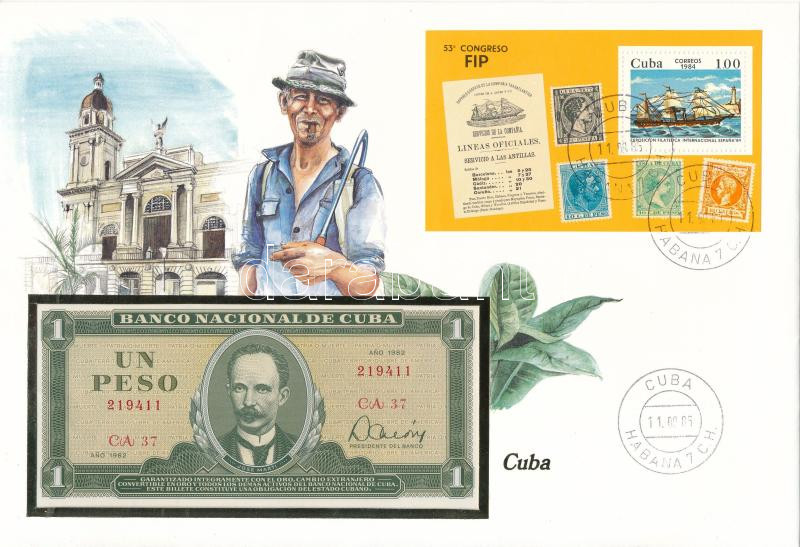 Kuba 1982. 1P felbélyegzett bankjegyes boríték bélyegzéssel, német nyelvű leírással T:UNC Cuba 1982. 1 Peso in banknote envelope with stamp and cancellation, with German description C:UNC