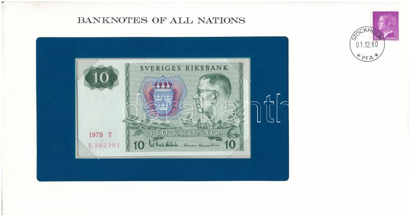 Sweden 1979. 10 Kronor in "Banknotes of all Nations" banknote envelope with stamp and cancellation C:UNC