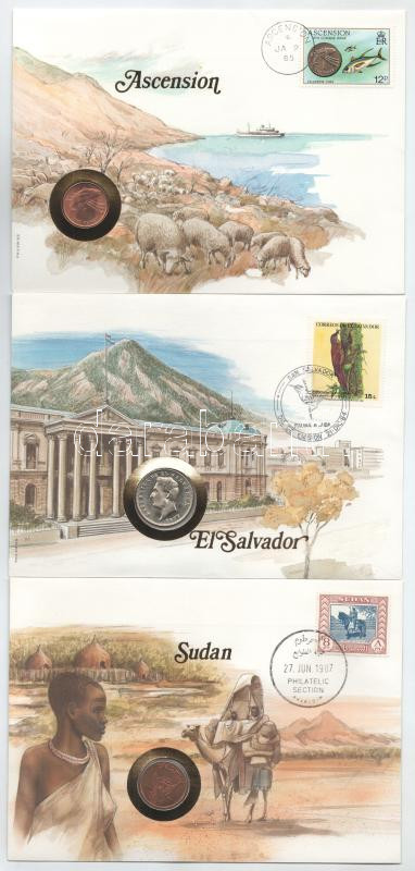 Vegyes, 3xklf érmés boríték tétel, bélyeggel, bélyegzéssel és német nyelvű leírással, benne: Ascension-sziget 1984. 1p "II. Erzsébet" + El Salvador 1977. 10c + Szudán 1972. 5m T:UNC