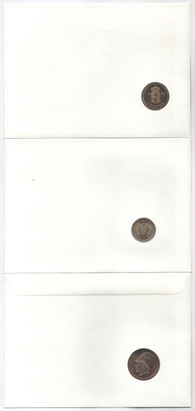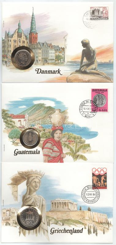 Vegyes, 3xklf érmés boríték tétel, bélyeggel, bélyegzéssel és német nyelvű leírással, benne: Dánia 1985. 1K + Görögország 1982. 20D + Guatemala 1981. 10c T:UNC, patina