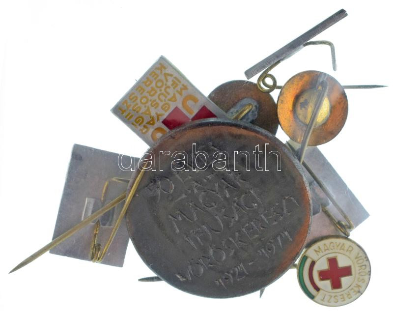 1971. "50 éves a Magyar Ifjúsági Vöröskereszt 1921-1971" cinkezett bronz emlékérem gyengébb tartásban (30mm) + DN "Magyar Ifjúsági Vöröskereszt - 50" műgyantás fém jelvény (5x) + 3xklf "Magyar Vöröskereszt" zománcozott bronz kitűző T:AU-VF, oxidáció az érmen