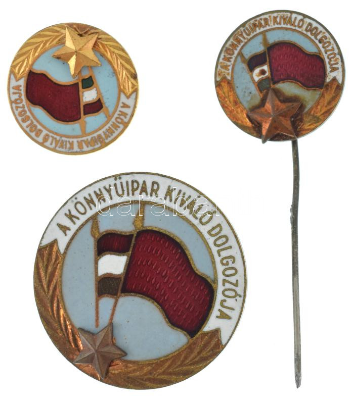 Leírás: DN (~1960) "A Könnyűipar Kiváló Dolgozója " zománcozott fém jelvény, miniatűrrel és miniatűr kitűzővel (30mm ; 18mm ; 18mm) T:AU, a kitűző VF - pótolt tűvel