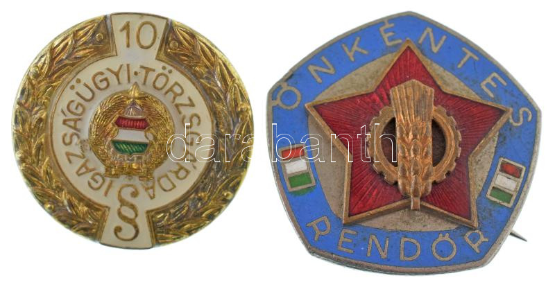 Leírás: DN (~1970) "Igazságügyi Törzsgárda - 10 év után " aranyozott, műgyantás kitüntető jelvény (26mm) + DN(~1970-1980) "Önkéntes rendőr " zománcozott fém jelvények (30x30mm) T:XF,VF, kis zománchiba