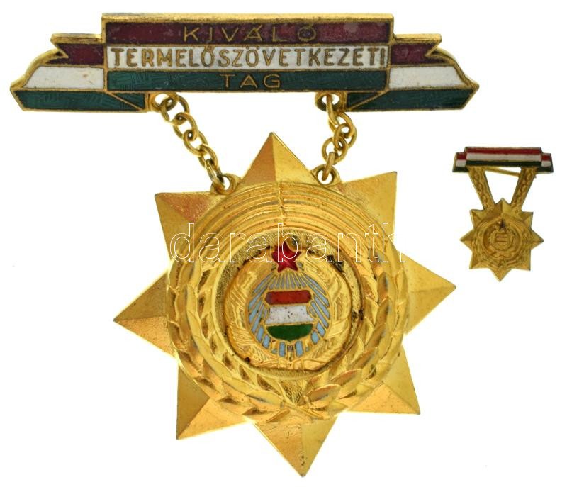 Leírás: DN (~1970) "Kiváló Termelőszövetkezeti Tag " Kádár-címeres, zománcozott, aranyozott bronz kitüntetés miniatűrrel T:XF, pici zománchiba