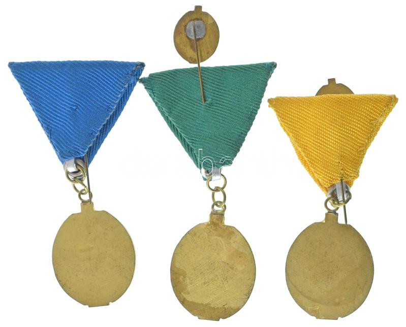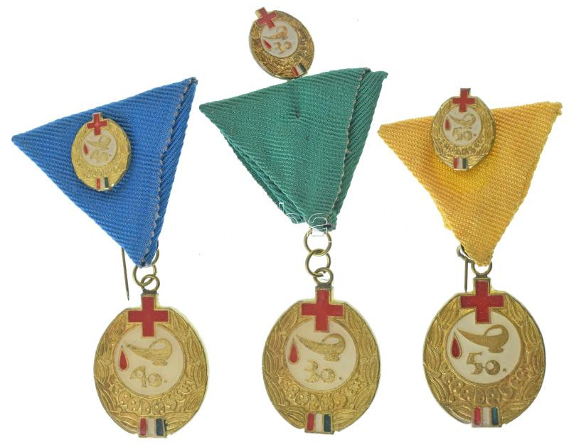 Leírás: DN(~1970-1980) "Véradásért " (3xklf: 30, 40 és 50 véradás után" részben műgyantás aranyozott bronz kitüntetések mellszalagon, miniatűrrel T:XF,VF
