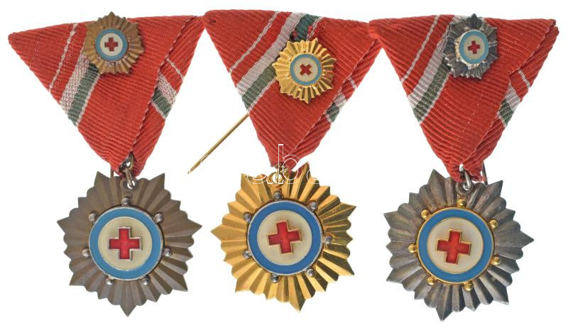 DN(~1980-1990) "Vöröskeresztes Tevékenységért Kitüntetés" (3xklf: bronz fokozat + ezüst fokozat + arany fokozat" részben zománcozott bronz / ezüstözött bronz / aranyozott bronz kitüntetések mellszalagon, miniatűrrel T:AU,XF