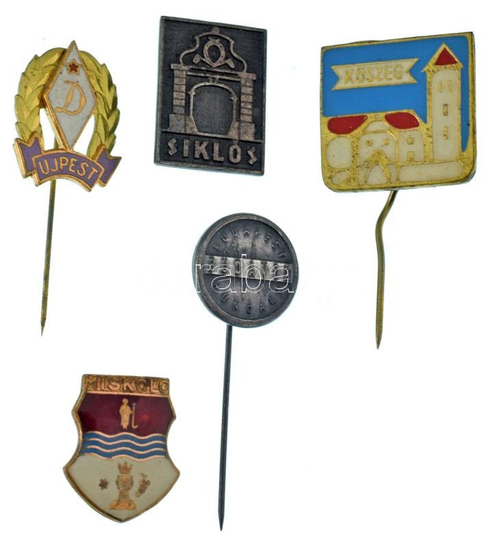 Leírás: Vegyes, 5db-os jelvény tétel, benne: "Miskolc" zománcozott fém jelvény + "Siklós" fém jelvény + "Kőszeg" zománcozott fém jelvény + "D (Dózsa) Újpest" zománcozott fém jelvény + "Budapest - Budavox" fém jelvény T:AU,XF