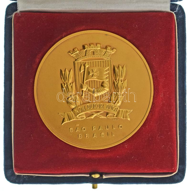 Brazília 1954. "A Páteo do Colégio alapításának 400. évfordulója emlékére" kétoldalas aranyozott bronz emlékérem eredeti dísztokban. Szign.: Olimpica. "Conduzindo suas Bandeiras, S?o Paulo vergou a Tordesillas - Páteo do Colégio - 1554 / S?o Paulo, Brasil" (69mm) T:AU
