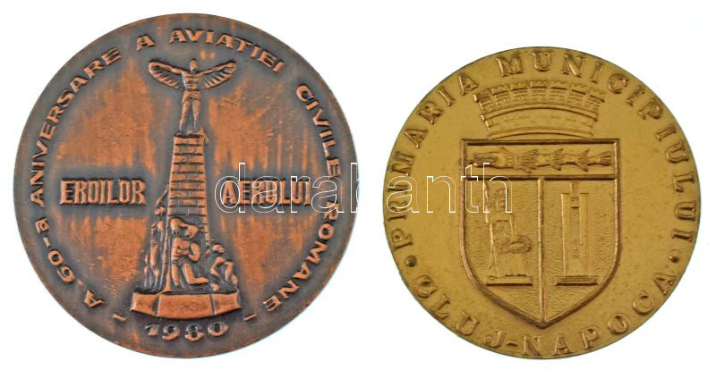 Románia 1980. "Román polgári légi közlekedés 1920-1980 / A román polgári légi közlekedés 60. évfordulója - Eroilor Aerului emlékmű 1980" kétoldalas bronz emlékérem (50mm) + DN "Glorie Ostasului Román műemlék / Kolozsvári Városháza" kétoldalas, aranyozott fém emlékérem (45mm) T:AU,XF