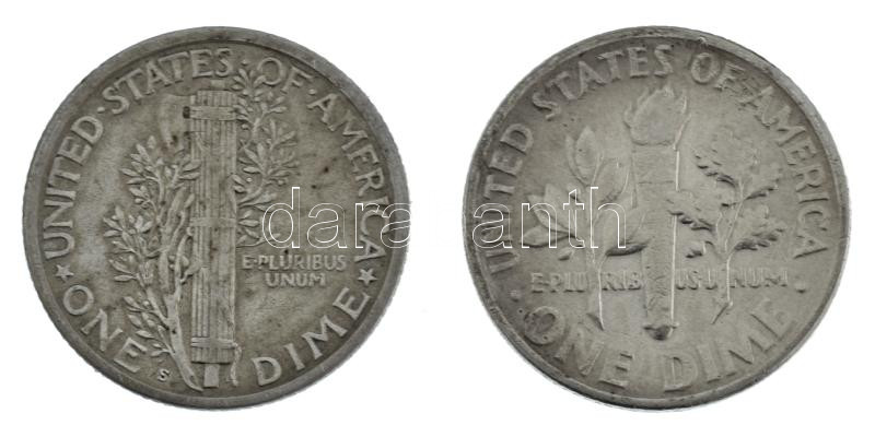 Amerikai Egyesült Államok 1917S 1d (10c) Ag "Mercury" + 1954. 1d (10c) Ag "Roosevelt" T:XF patina