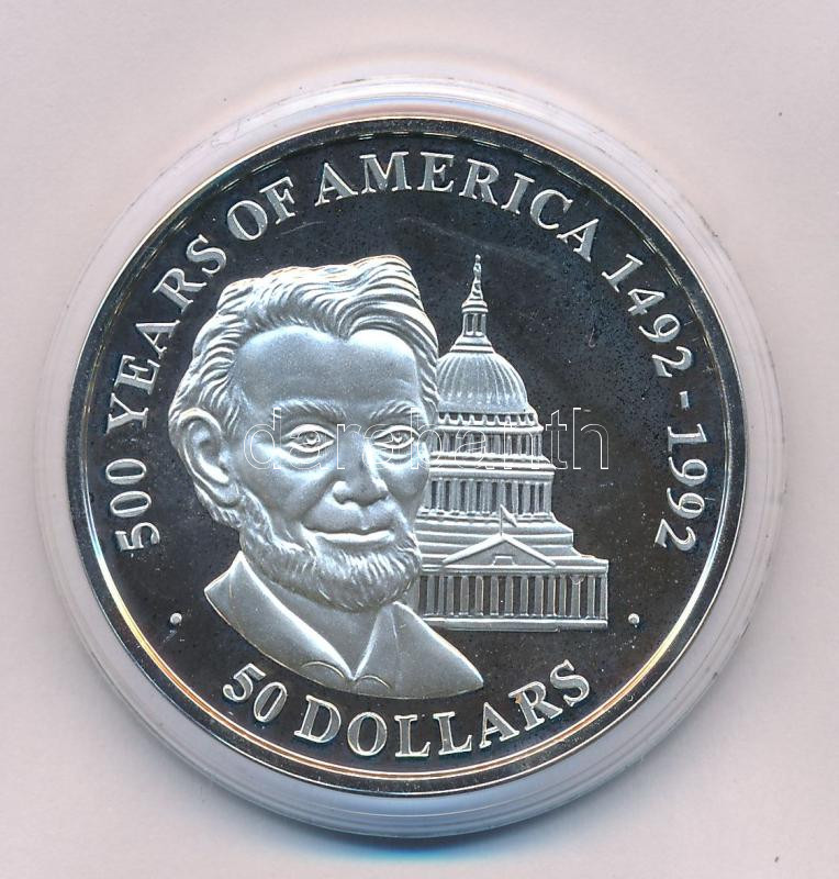 Cook-szigetek 1990. 50$ Ag "500 éves Amerika 1492-1992 - Abraham Lincoln" kapszulában T:PP