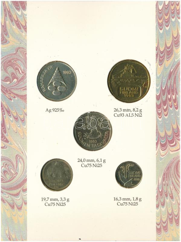 Leírás: Finnország 1993. 10p - 5M Cu-Ni (4xklf) forgalmi összeállítás + "Finn verde " jelzett Ag zseton szettben, karton dísztokban (0.925/24,5mm) T:UNC