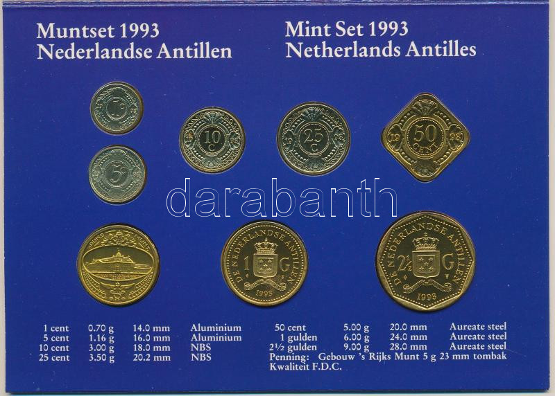Leírás: Holland Antillák 1993. 1c - 2 1/2G (7xklf) forgalmi sor + "Holland verde " zseton szettben, karton dísztokban T:UNC