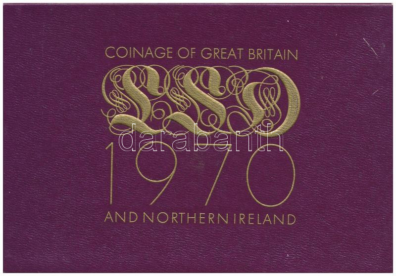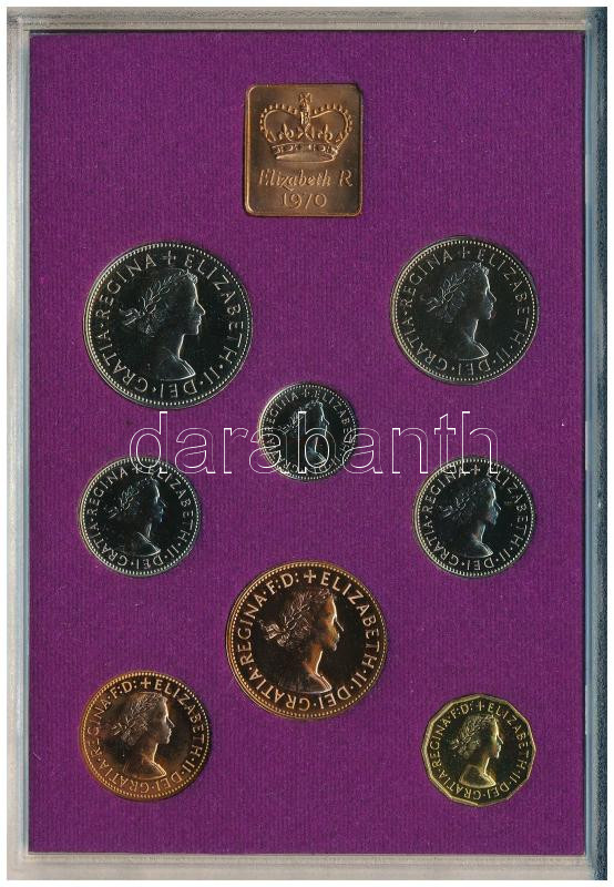 Nagy-Britannia 1970. 1/2p-1/2C (8xklf) hivatalos forgalmi sor lezárt dísztokban, borítékban + "1970. Elizabeth R / Royal Mint" verdei zsetonnal, angol nyelvű ismertetővel T:PP