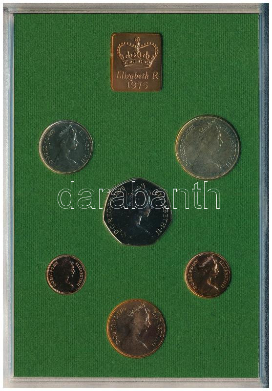 Nagy-Britannia 1975. 1/2p-50p (6xklf) hivatalos forgalmi sor lezárt dísztokban, borítékban + "1975. Elizabeth R / Royal Mint" verdei zsetonnal T:PP