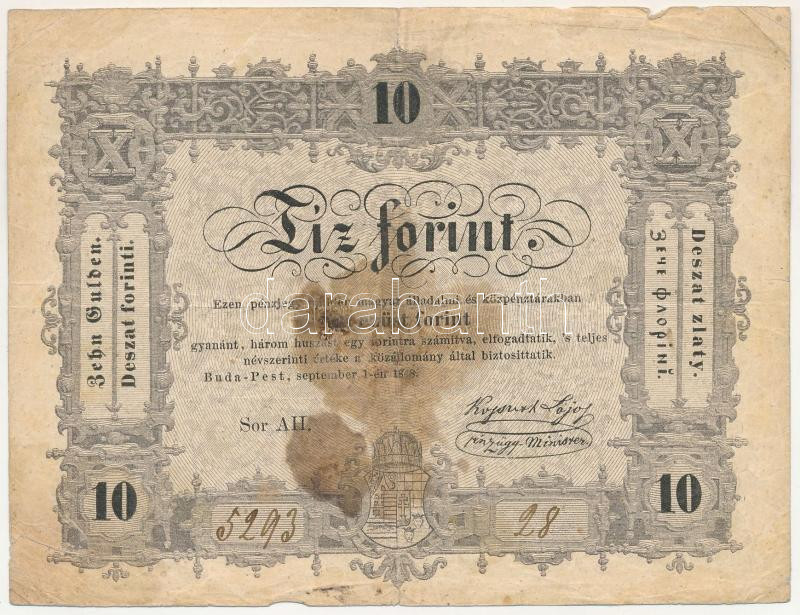 1848. 10Ft "Kossuth bankó" "AH. 5293 28" T:F,VG be... https://www.darabanth.com/hu/510-Gyorsarveres/510.0/Numizmatika/Magyar-bankjegyek~691/1848-10Ft-Kossuth-banko-AH-5293-28-TF-VG-beszakadasok-folt3Cbr-3E-Adamo-G111~II3454426