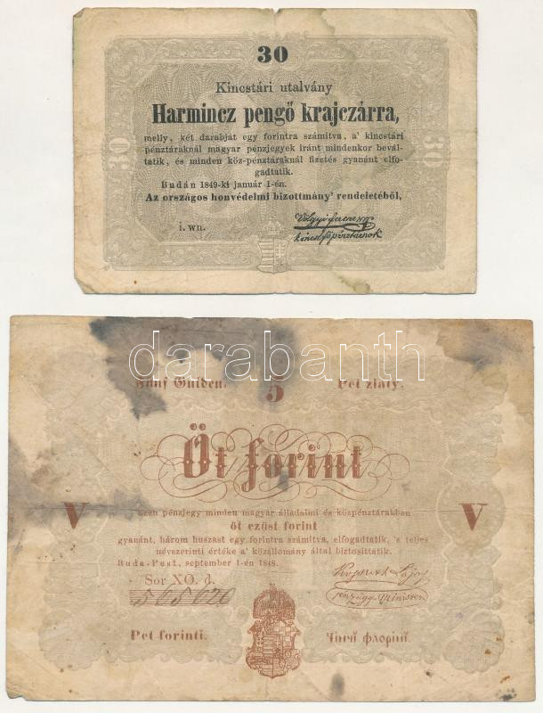 Leírás: 1848. 5Ft barna nyomat "XO.d. 565620" "Kossuth bankó " + 1849. 30kr "Kossuth bankó" T:F,VG ázásnyomok, foltok