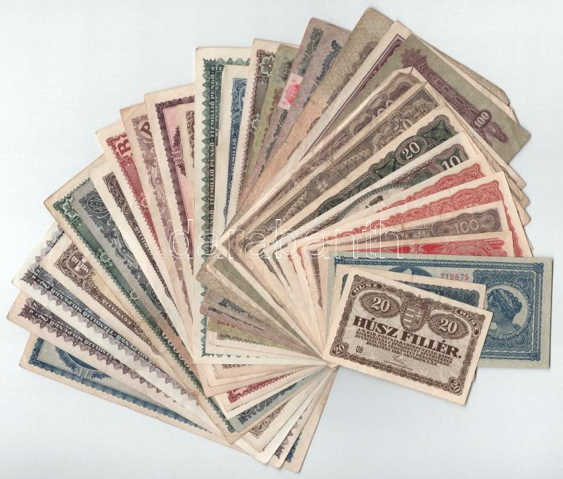 Leírás: Vegyes, 31db-os magyar bankjegy tétel, benne: 1916-1946. 1K-100K (9xklf) + 20f + 50f + 100P-1.000.000.000P (11xklf) + 10.000BP-1.000.000BP (3xklf) + 10.000-1.000.000.000MP (6xklf) T:VG-F