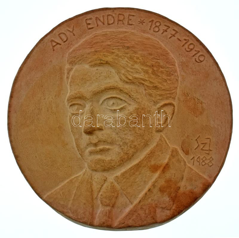Leírás: 1988. "Ady Endre 1877-1919 " egyoldalas kerámia emlékérem. Szign.: Sz. J. (158mm) T:AU hátoldalán lyukasztott