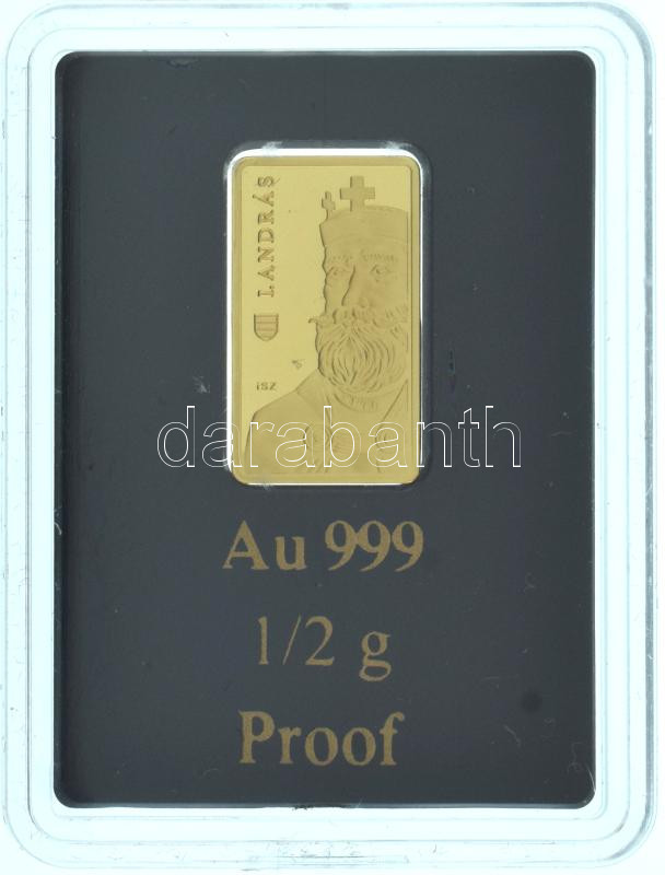 Leírás: Ifj. Szlávics László (1959-) DN "Arany királyok - I. András" jelzett Au emlékveret kapszulában, tanúsítvánnyal (0,5g/0.999/15,2x8,6mm) T:PP