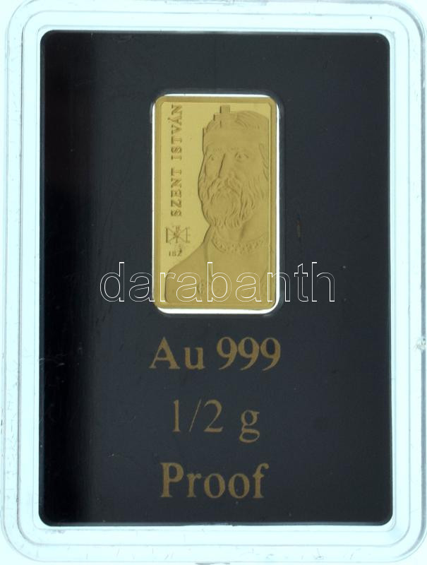 Leírás: Ifj. Szlávics László (1959-) DN "Arany királyok - Szent István" jelzett Au emlékveret kapszulában, tanúsítvánnyal (0,5g/0.999/15,2x8,6mm) T:PP