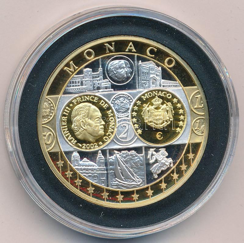 Leírás: 2002-2010 k. "Emlékérem az euróövezet országainak közös valutájáról - Monaco" aranyozott, ezüstözött Cu-Ni emlékérem kapszulában, tanúsítvánnyal (35mm) T:PP