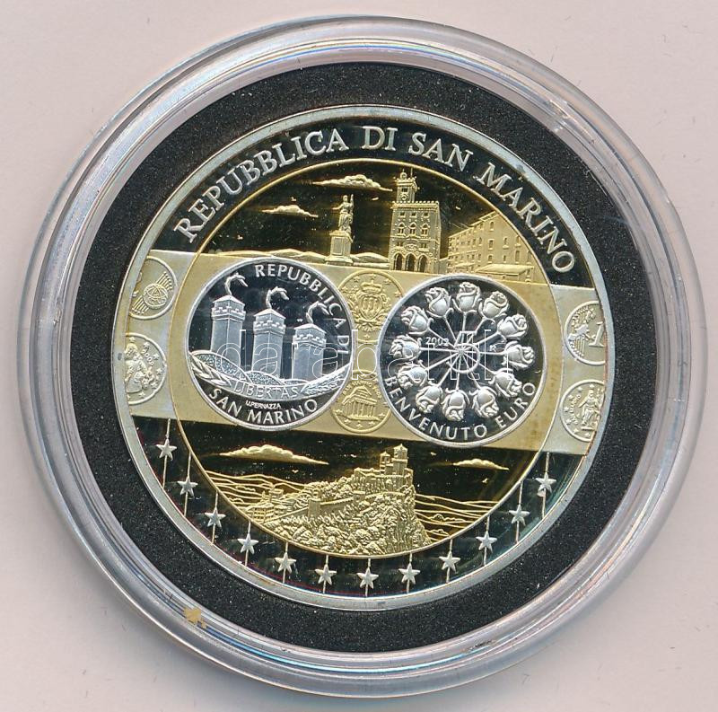 2002-2010 k. "Emlékérem az euróövezet országainak közös valutájáról - San Marino" aranyozott, ezüstözött Cu-Ni emlékérem kapszulában, tanúsítvánnyal (35mm) T:PP patina