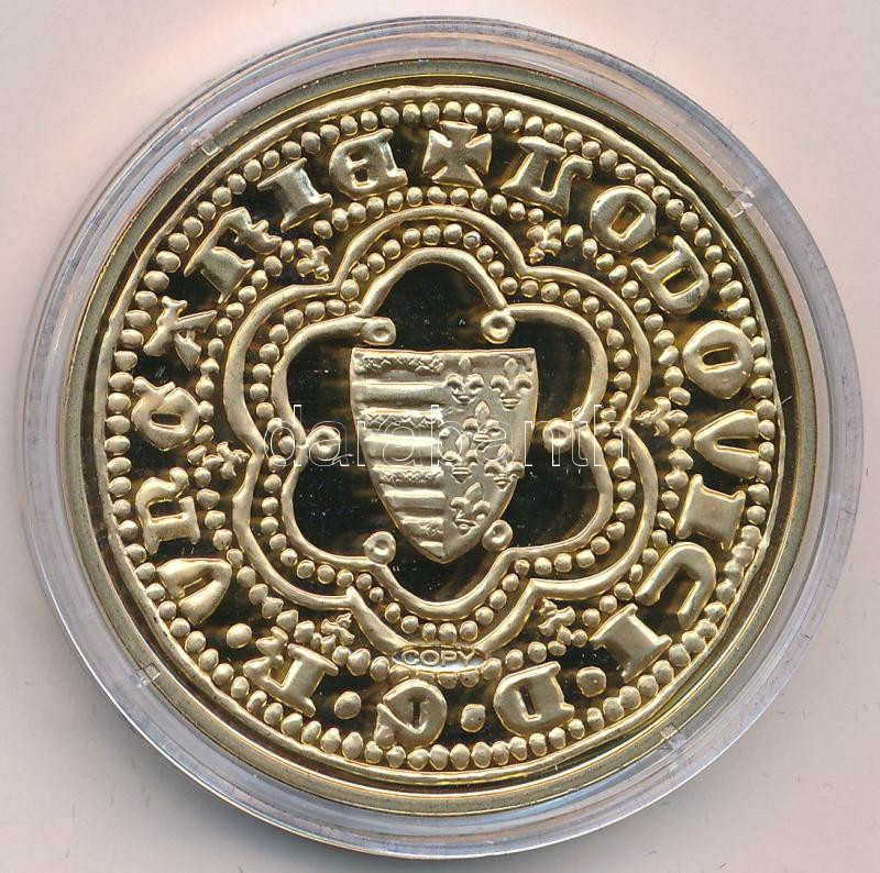 DN "A legértékesebb magyar érmék - Nagy Lajos aranyforintjának replikája" aranyozott Cu emlékérem kapszulában, "COPY" jelzéssel, színes tájékoztatóval (40mm) T:PP